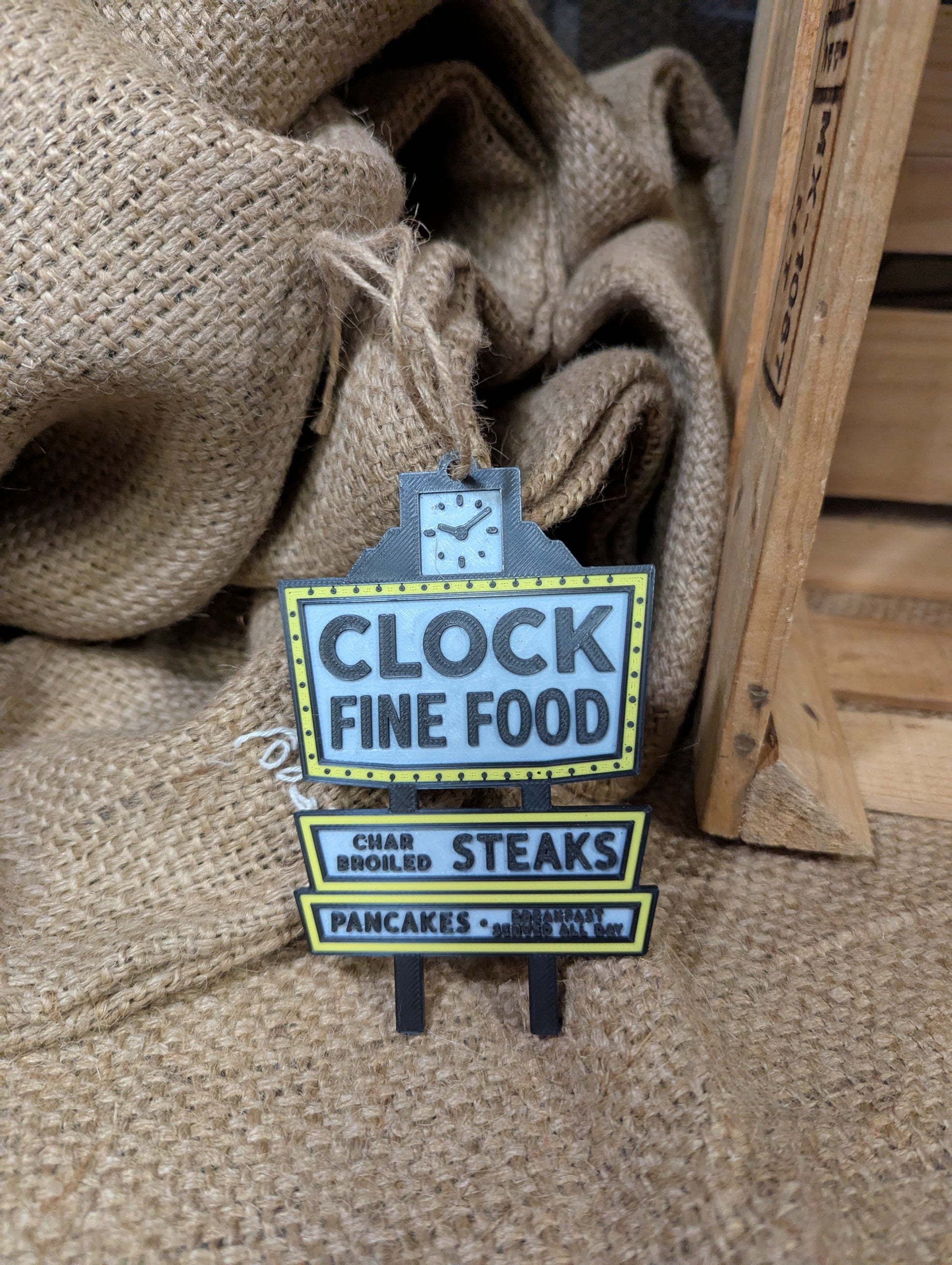 Styled after the famous Alpine Ave. Clock Fine Food sign, this ornament adds a retro GR touch to your décor.