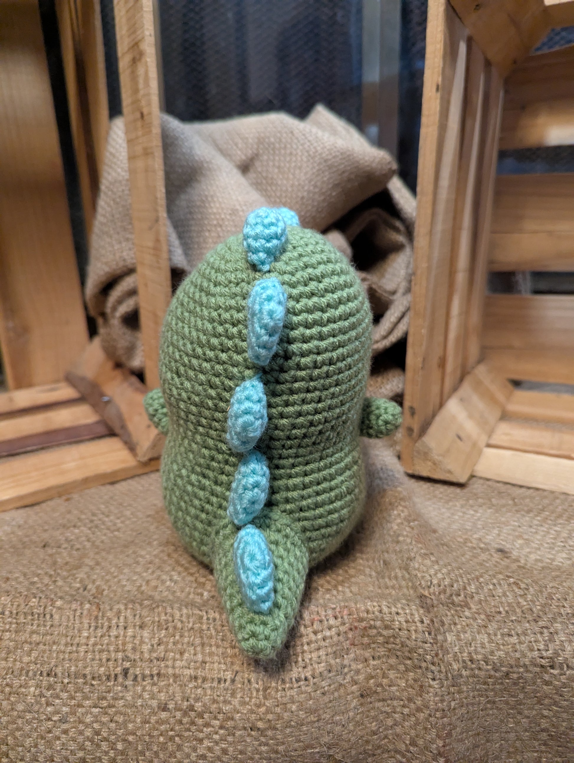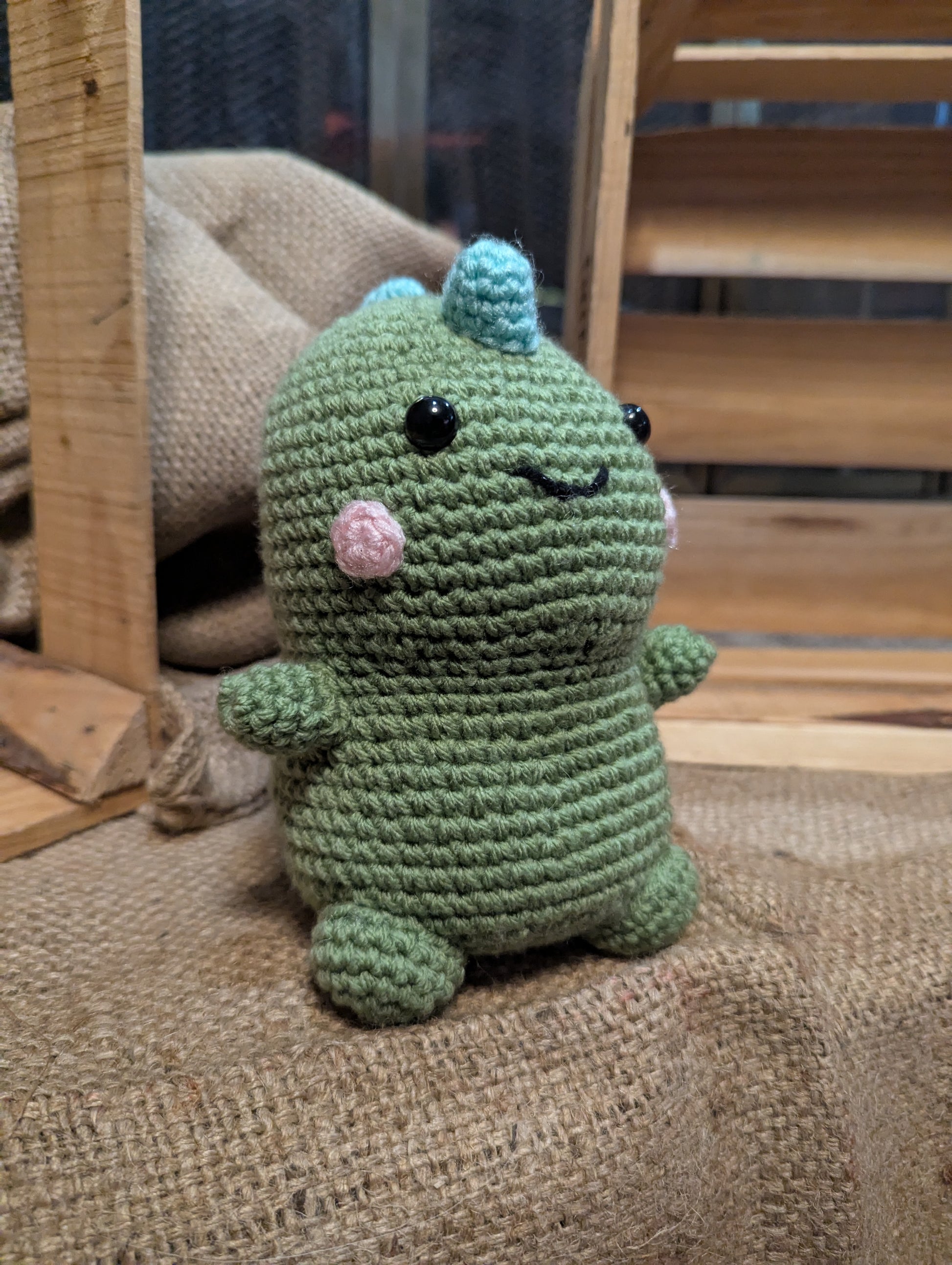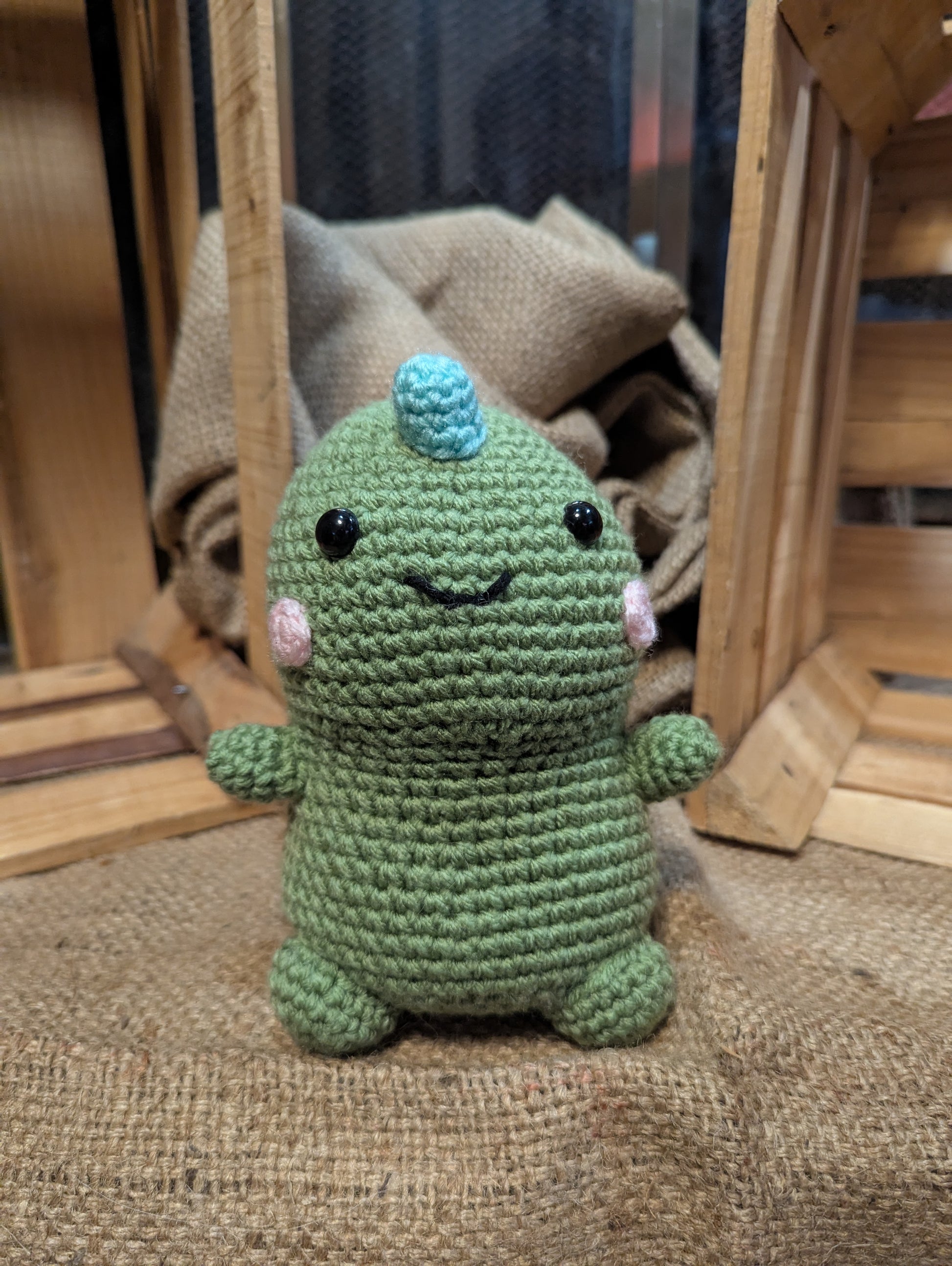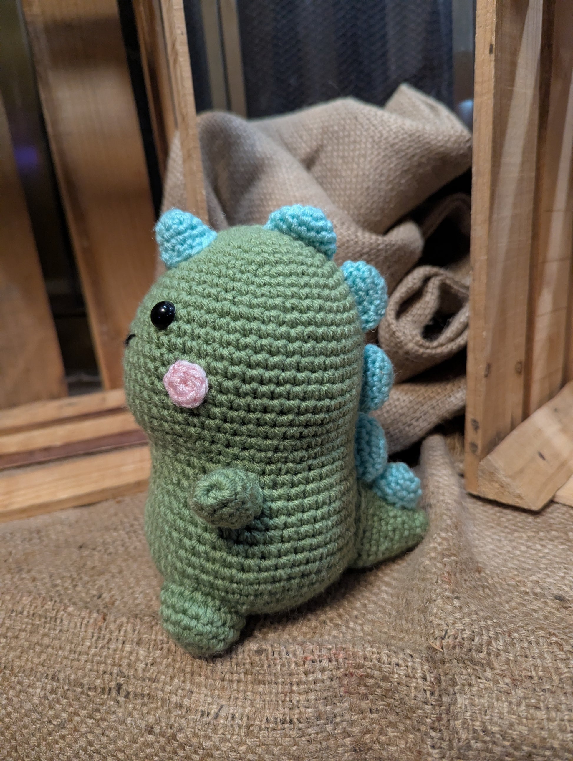 Handmade crochet plushie — Dino. Approx. size: 5.5 in x 6 in x 7.5 in. Soft, huggable, and crafted with care.
