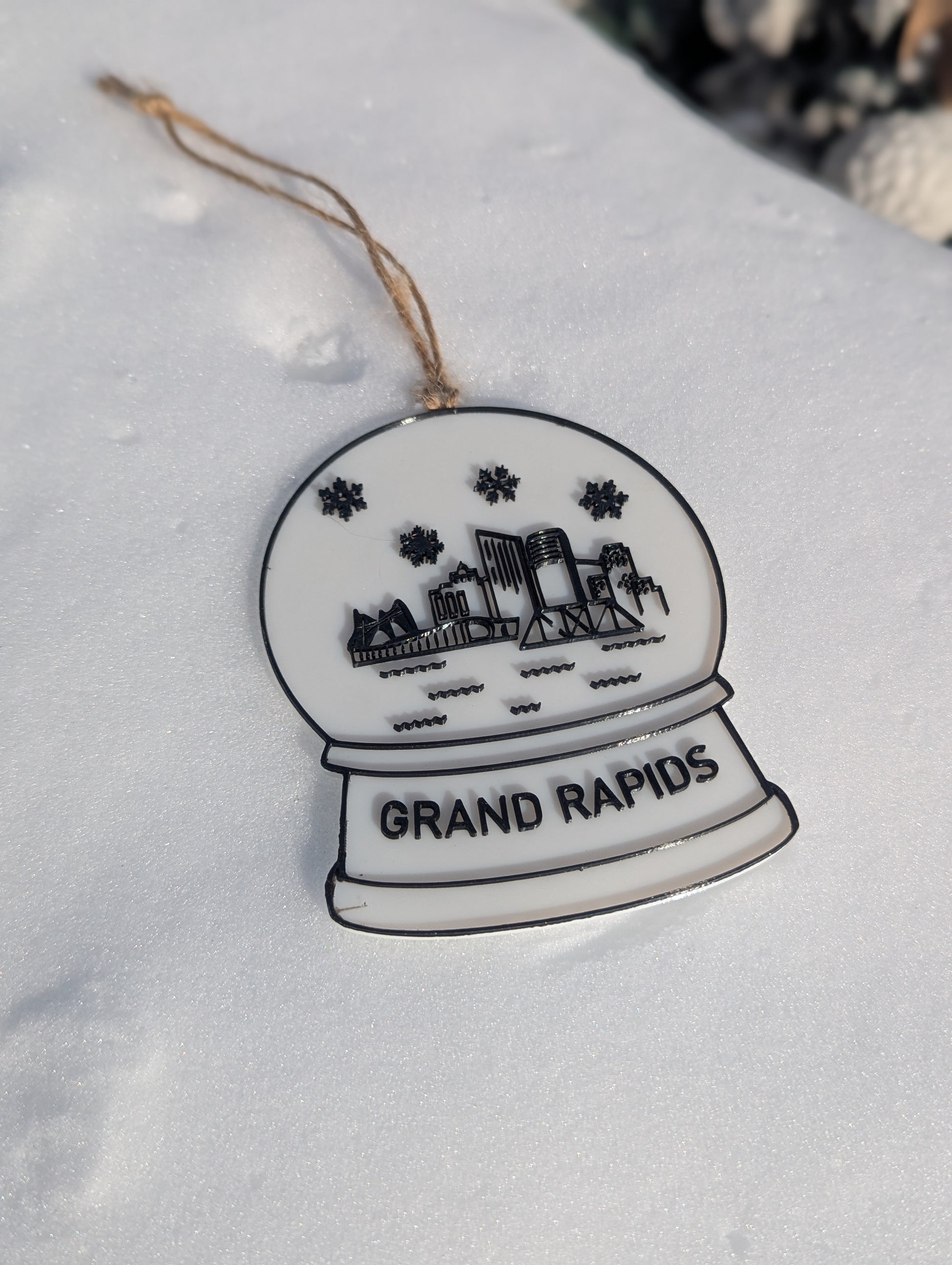- Design: Includes key Grand Rapids skyline elements within a snow globe frame.
