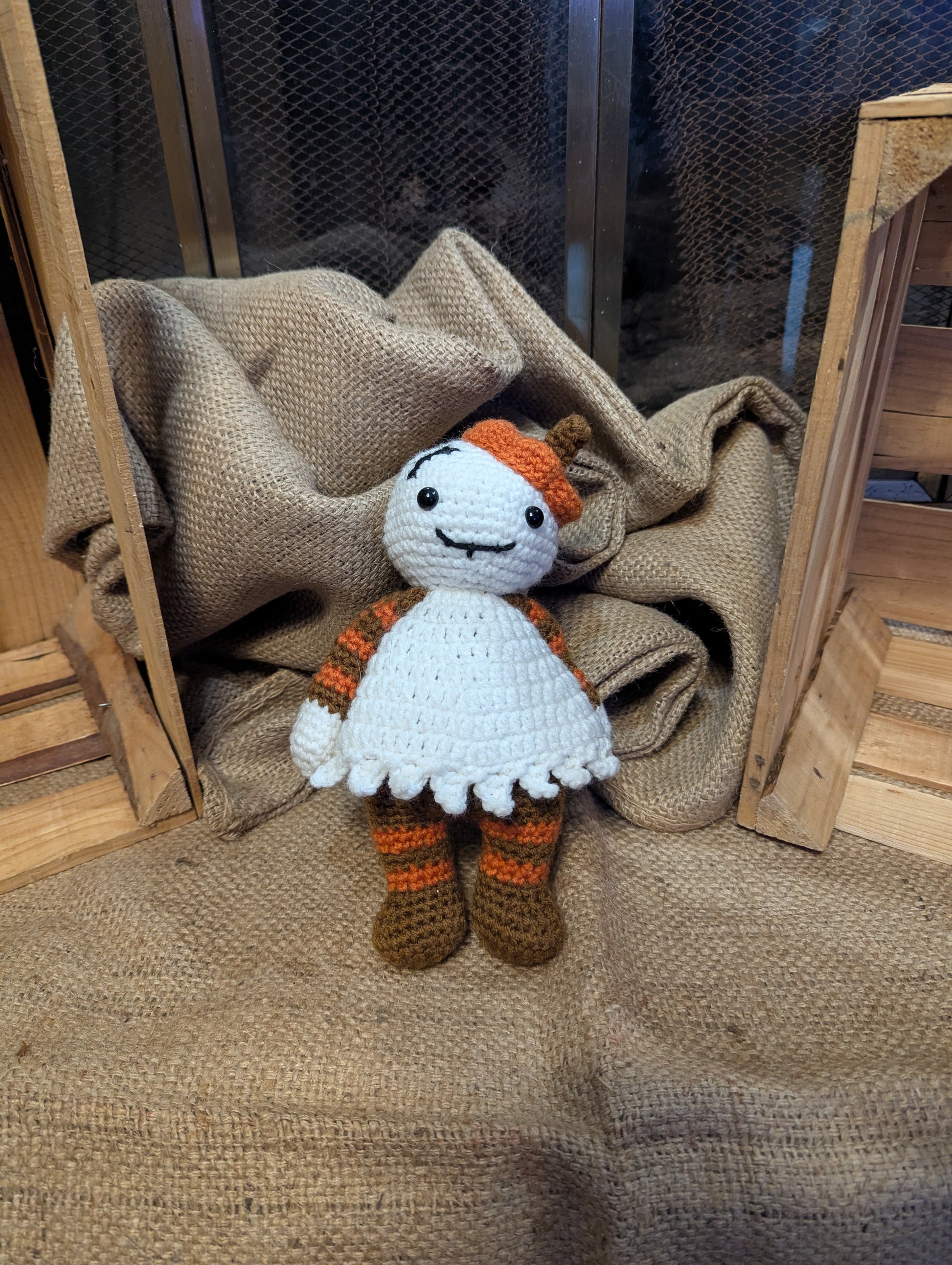 Handmade crochet Halloween plushie — Pumpkin Ghost. Approx. size: 10 in x 6.5 in x 3.5 in. Soft, huggable, and crafted with care.