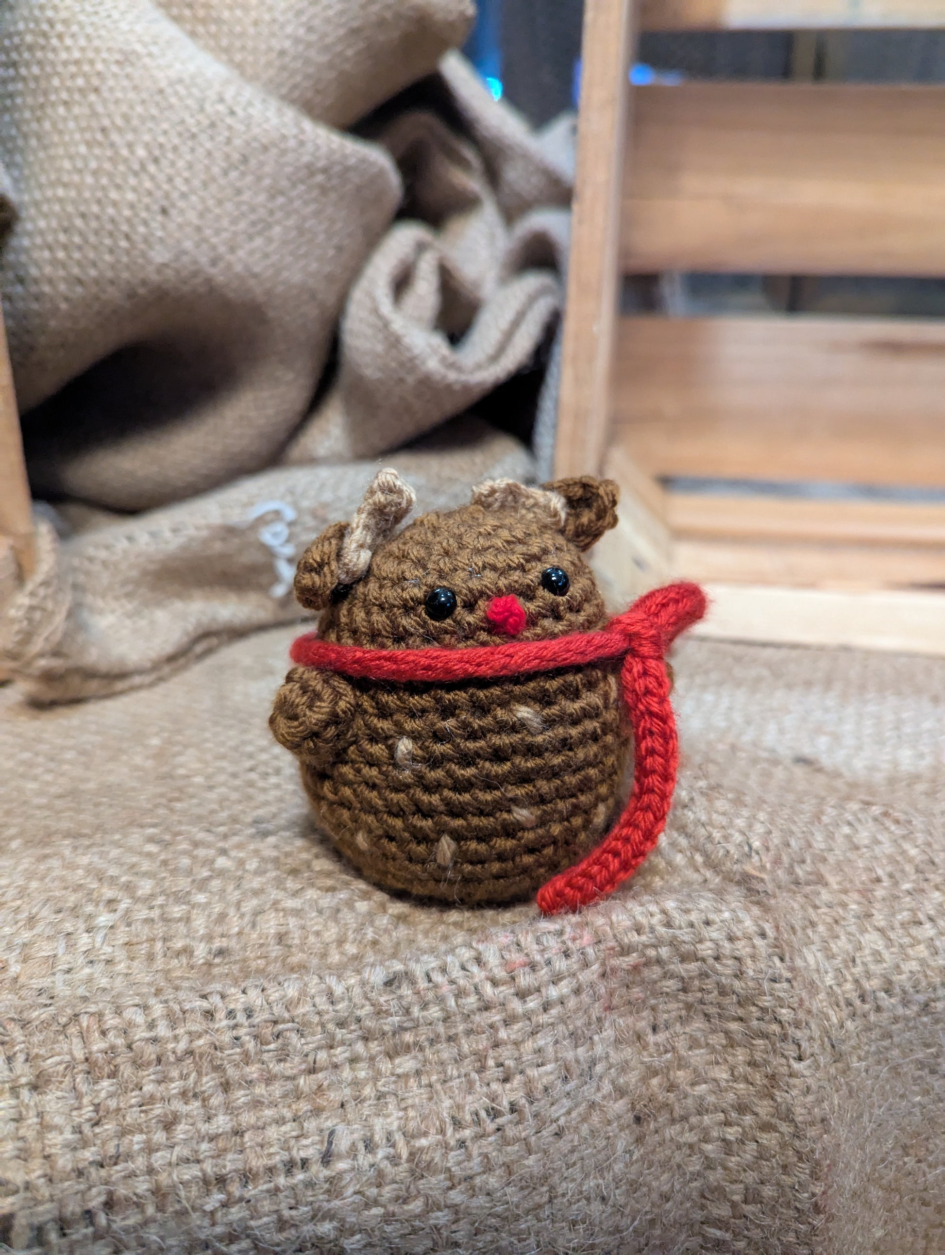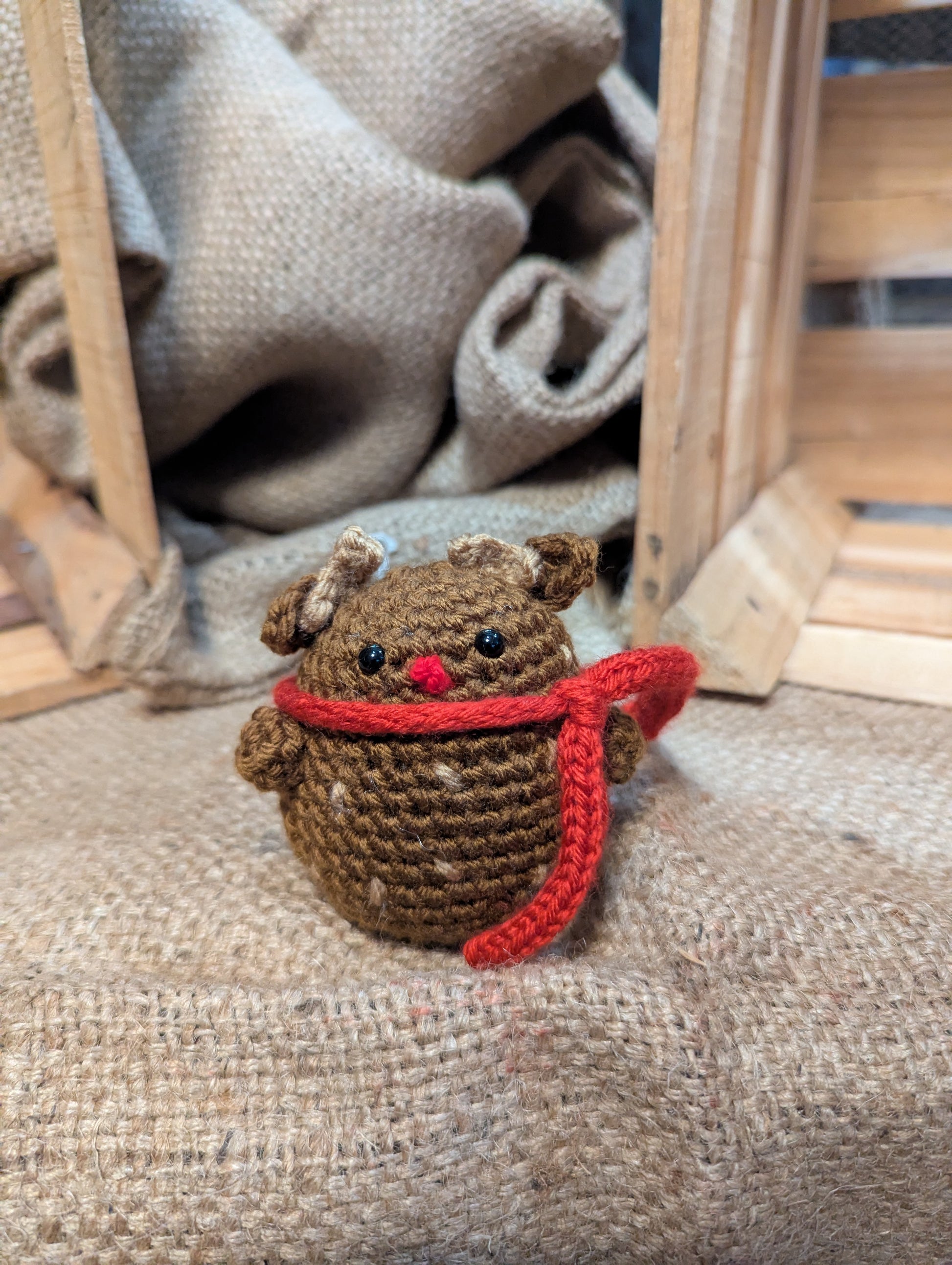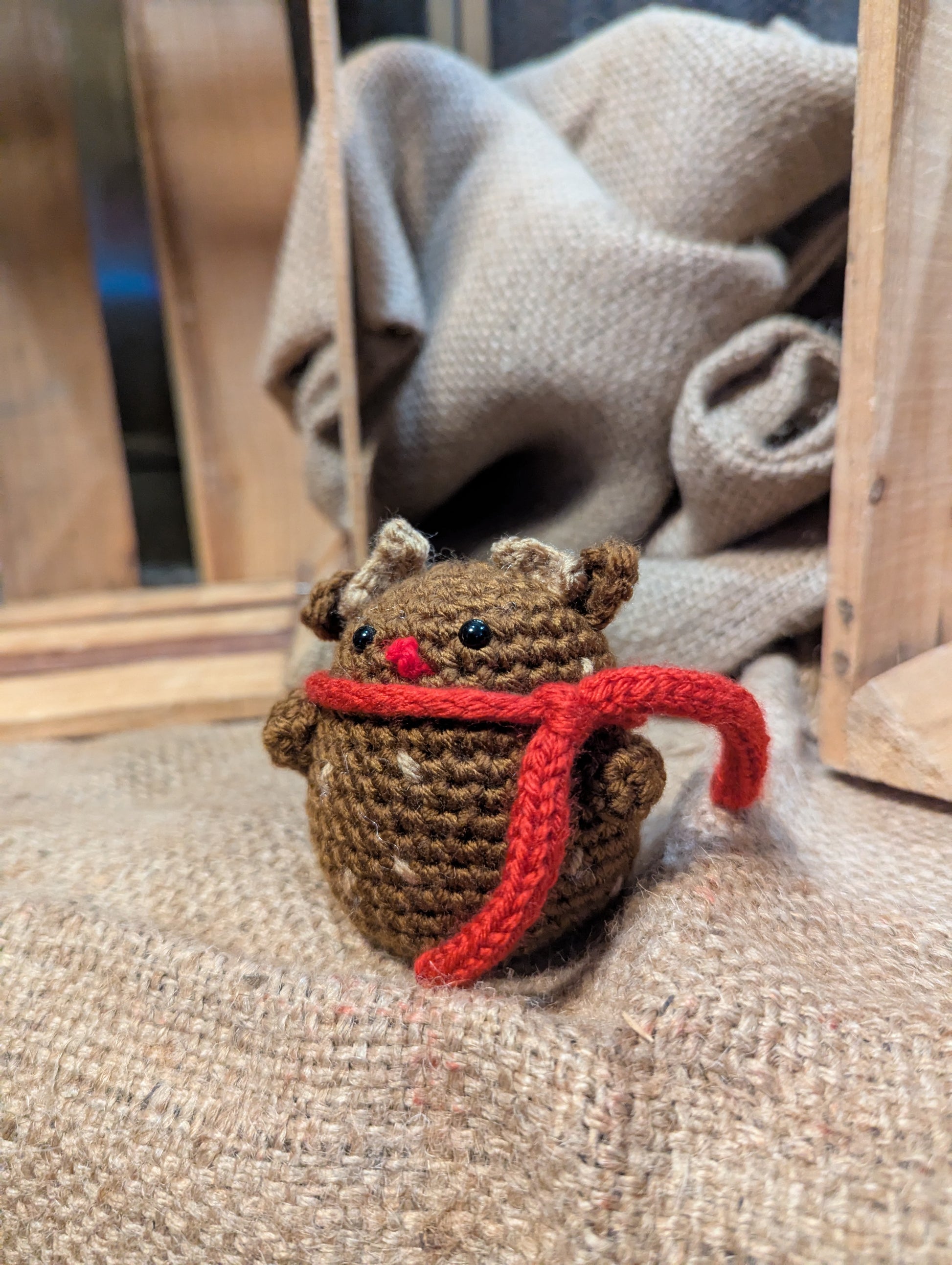 Handmade crochet holiday plushie — Reindeer. Approx. size: 2.5 in x 2.5 in x 3 in. Soft, huggable, and crafted with care.