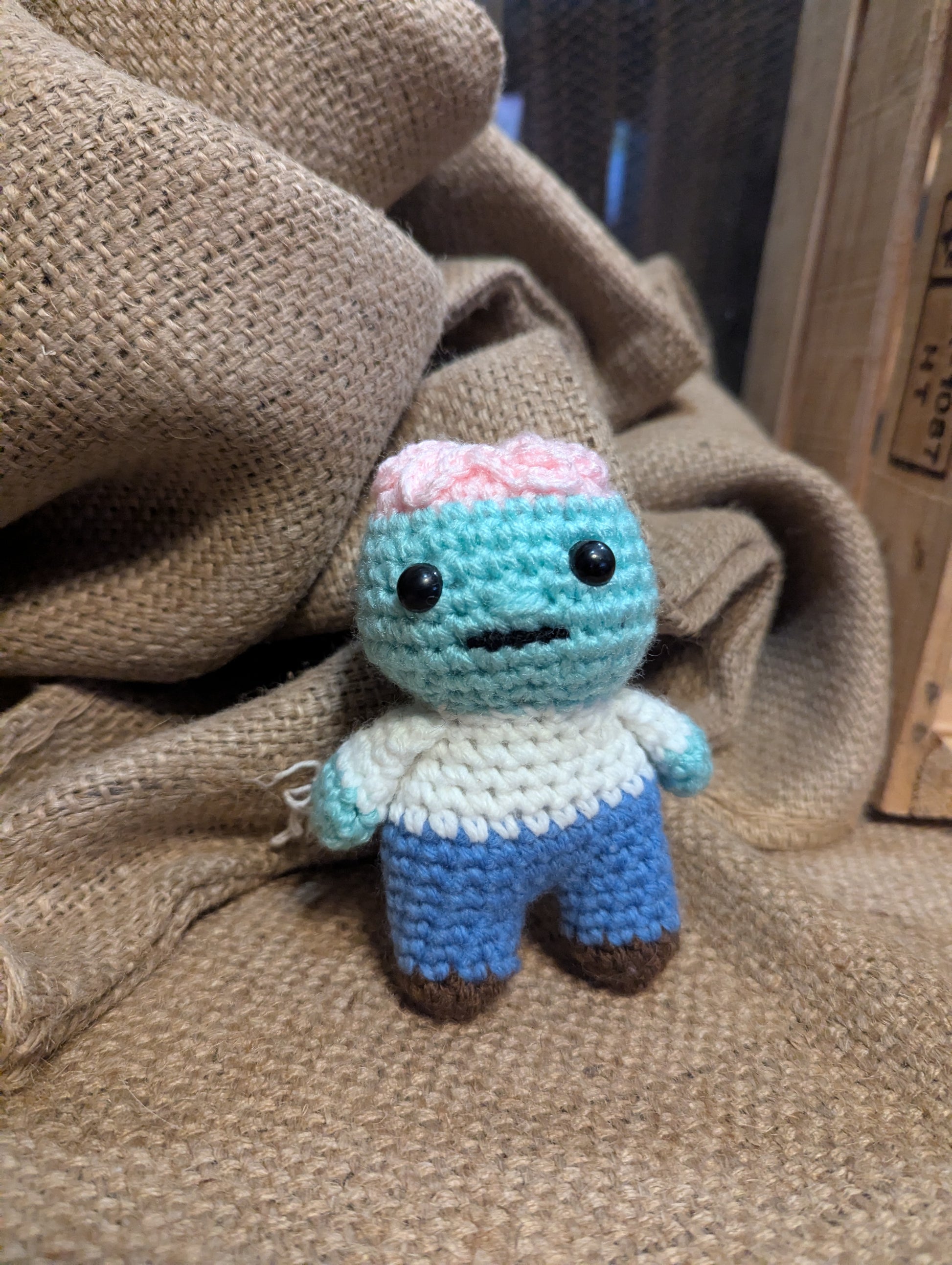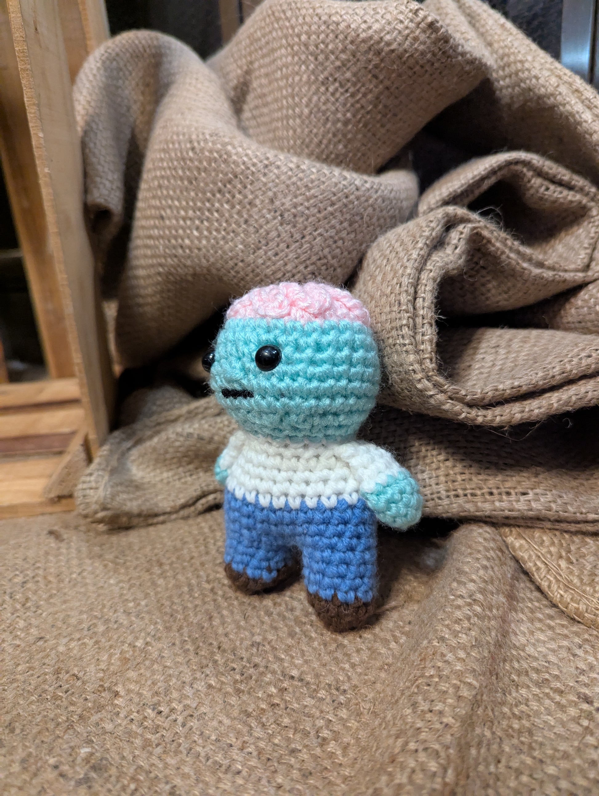 Handmade crochet halloween plushie — Zombie. Approx. size: 4 in x 5 in x 2.5 in. Soft, huggable, and crafted with care.